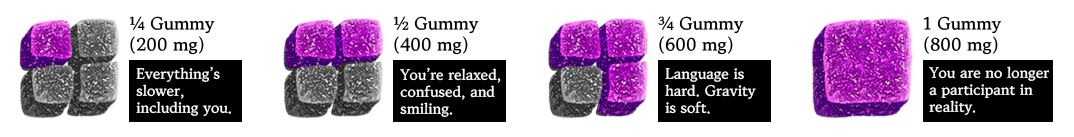Not for beginners. Start with ¼ to ½ gummy and wait at least 2 hours before increasing. Do not exceed 2 gummies in 24 hours. These are for experienced users only.