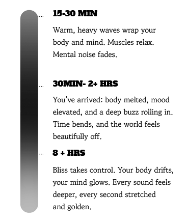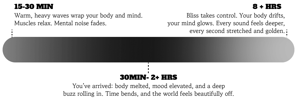 Users may experience: Relaxation, Elevated mood, Enhanced sensory perception, Stress relief. Effects vary based on individual factors such as body weight, metabolism, and tolerance.