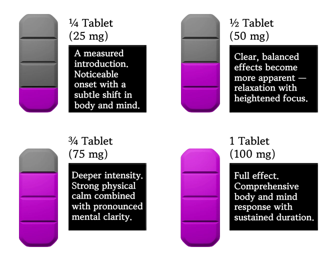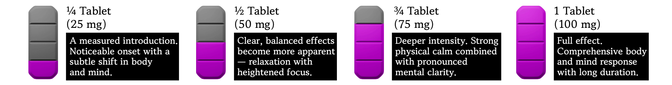 Start Low: Begin with ¼ tablet (12.5mg) to assess tolerance. Wait: Allow at least 90 minutes to gauge effects. Adjust: If needed, incrementally increase the dose in future sessions. Always consult with a healthcare professional before starting any new supplement regimen.