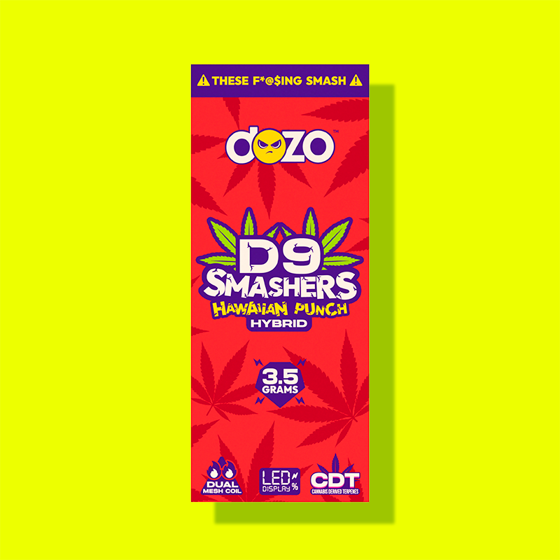 The 3.5g Dozo D9 Smashers THC-A Disposable delivers a potent blend of cannabinoids, including THC-A, Delta-9 THC, and THC-P.