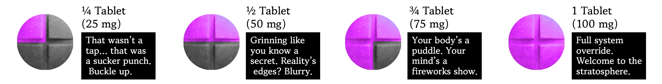 Each bar contains 100mg of 7-Hydroxymitragynine. It’s recommended to start with ¼ tablet (25mg) to assess individual tolerance. Wait at least 90 minutes before considering an additional dose.