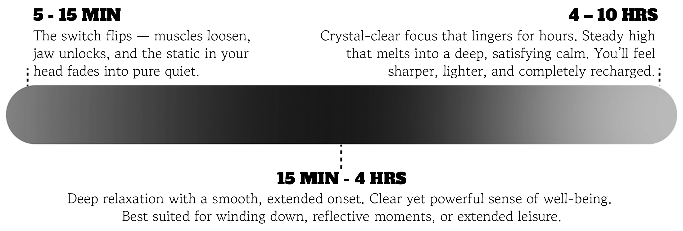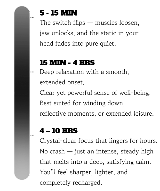 Users may experience: Enhanced mood, Relaxation, Mental clarity. Effects vary based on individual factors such as body weight, metabolism, and tolerance.