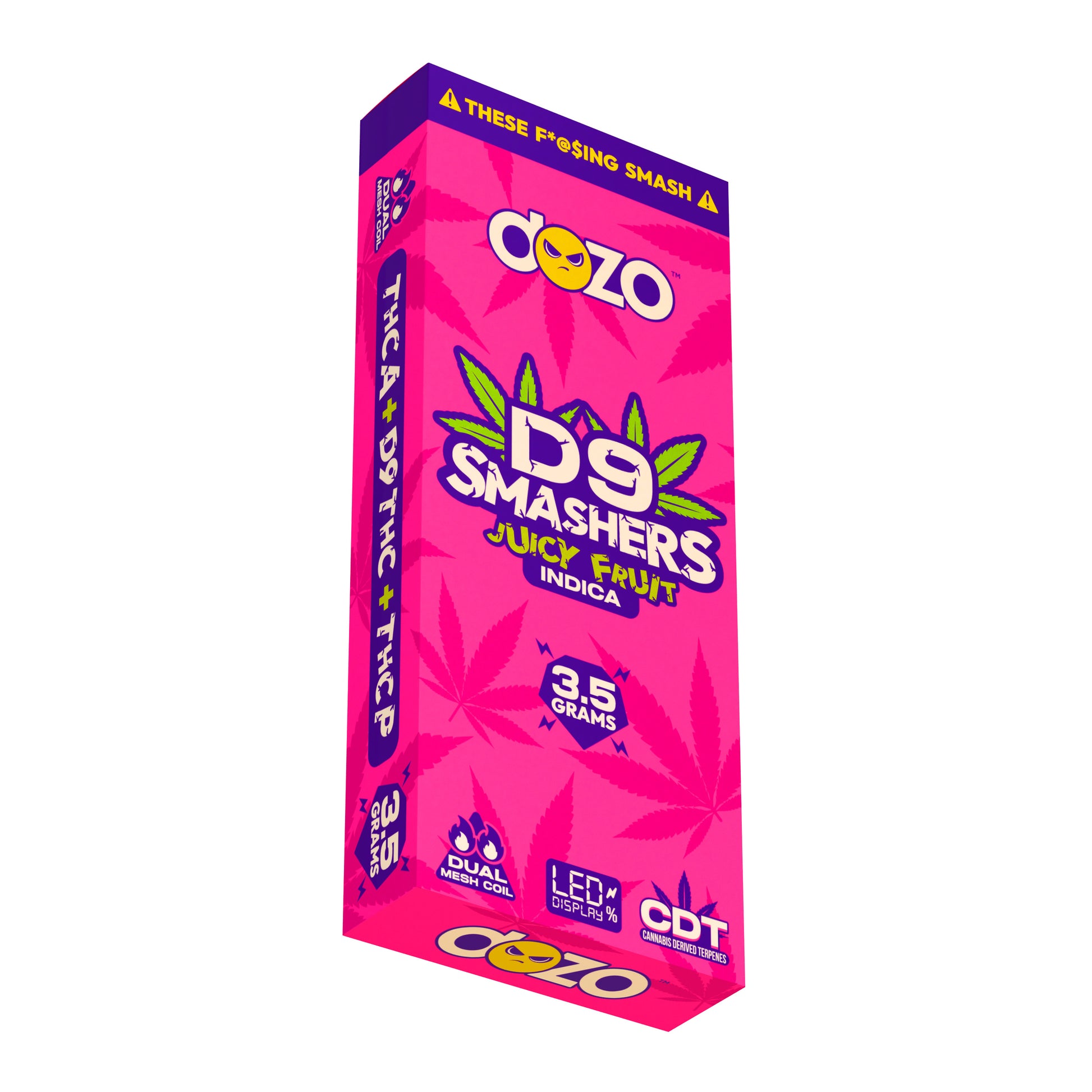 The 3.5g Dozo D9 Smashers THC-A Disposable delivers a potent blend of cannabinoids, including THC-A, Delta-9 THC, and THC-P.