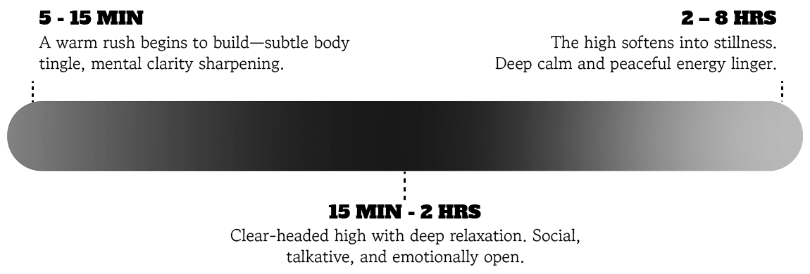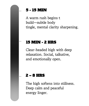 Users may report increased focus, relaxed energy, and enhanced mood. Experience may vary depending on personal tolerance and body chemistry.
