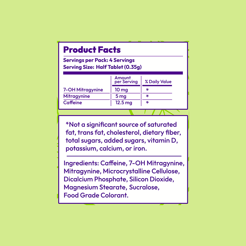 Each tablet contains 35mg of 7-Hydroxymitragynine. It’s recommended to start with ½ tablet (17.5mg) to assess individual tolerance. Wait at least 90 minutes before considering an additional dose.