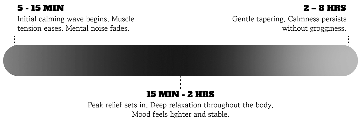 Users may experience: Enhanced mood. Relaxation. Mental clarity. Effects vary based on individual factors such as body weight, metabolism, and tolerance.