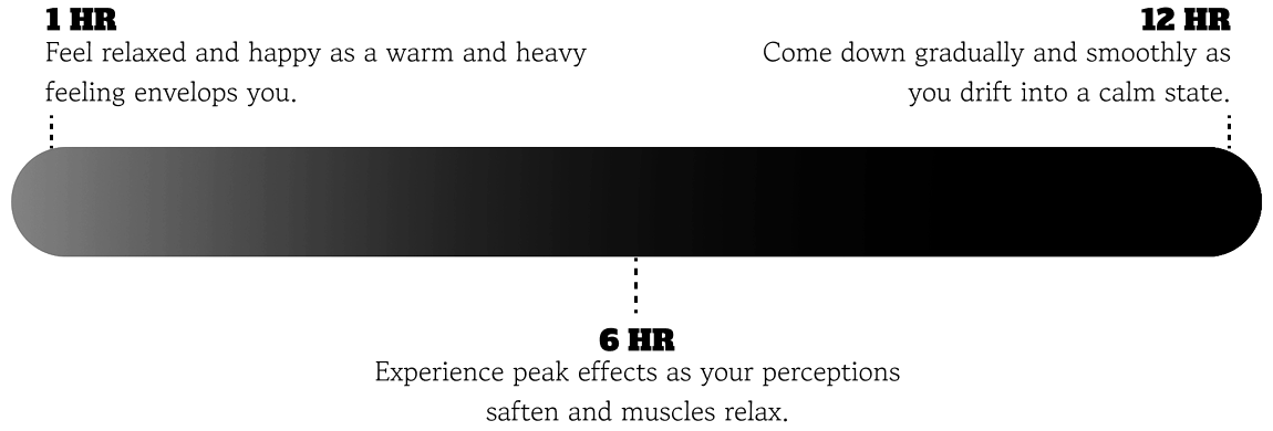 Kick-in time: ~30 minutes. Full experience can last 4 to 6 hours, with lingering afterglow depending on your vibe and how much you took.